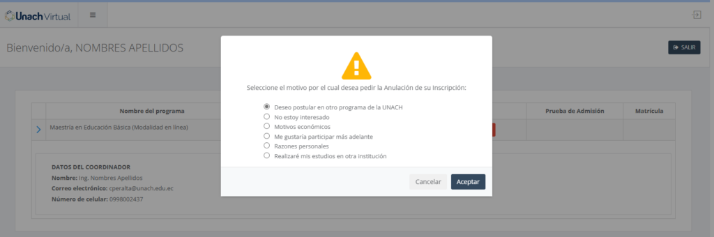 Le aparecerá una pantalla emergente en la que deberá elegir el motivo por el cual desea Anular su Inscripción en ese programa de Maestría: