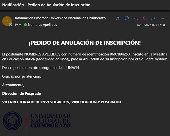 Adicionalmente, se envía el pedido de Anulación de Inscripción mediante un correo electrónico al responsable del proceso de Admisión: