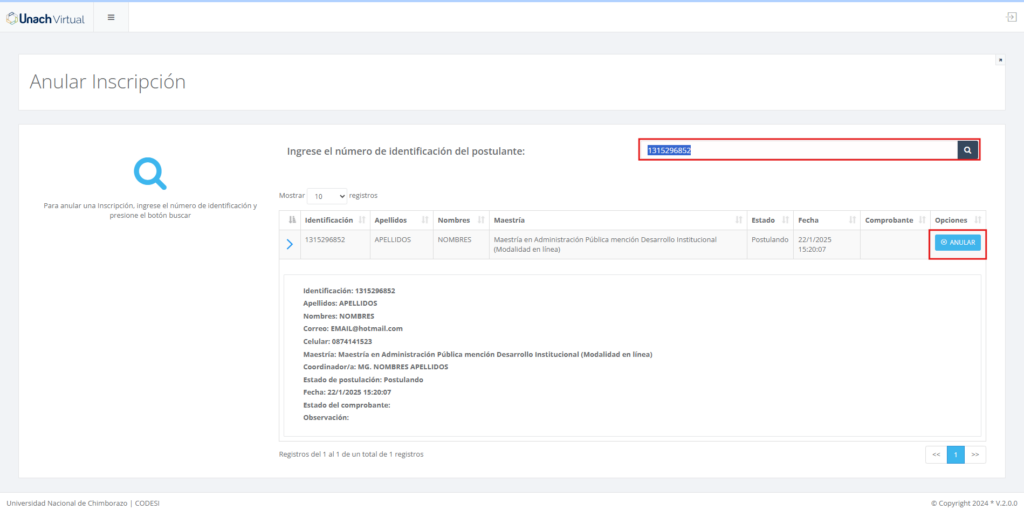 Al ingresar a la opción del menú “Anular Inscripción Postulante” aparecerá una pantalla en la que deberá ingresar el número de cédula del postulante de quien se requiere Anular la Inscripción y a continuación presionar en el botón de búsqueda. Si el número de cédula es correcto aparecerá la información del proceso de inscripción y adicionalmente el botón “ANULAR“: