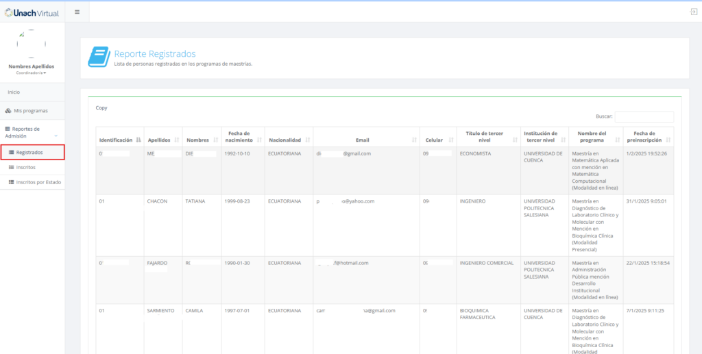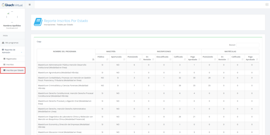 Cada reporte cuenta con la opción “Copy“, la cual permite copiar la información que se muestra en el reporte y se la puede pegar en una hoja de Excel para realizar los filtros requeridos. Además, en la parte superior se dispone una opción “Buscar”, la cual permite ingresar cualquier texto, el cual filtra la información en base a las coincidencias encontradas en todos los campos de información que muestra el reporte.