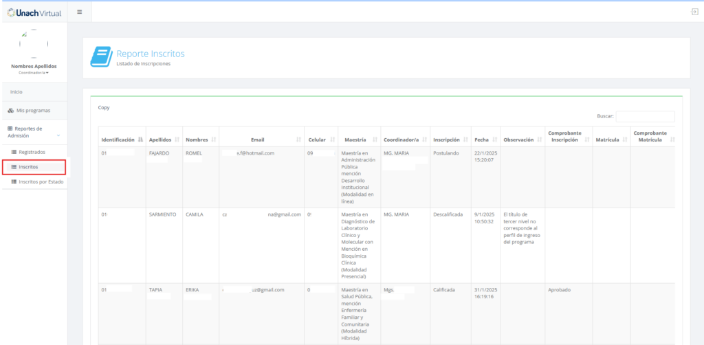 Los Reportes de Admisión están habilitados para todos los usuarios quienes tienen un correo institucional y tienen asignado un rol en el sistema, se puede acceder a los mismos a través de las opciones del menú “Reportes Admisión”, debajo del cual encontraremos los siguientes reportes: