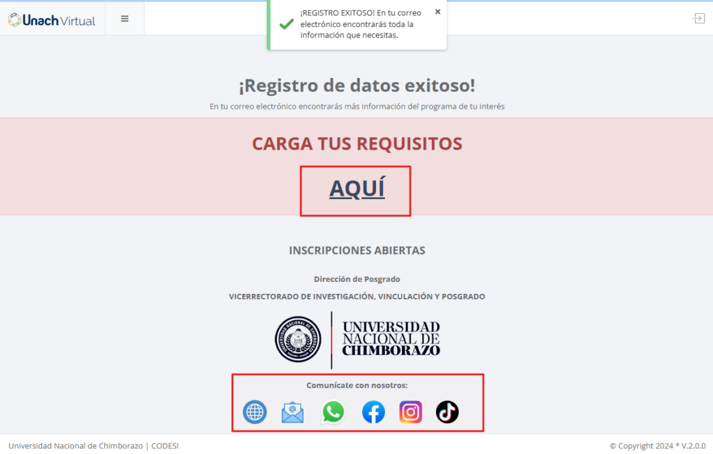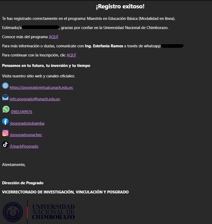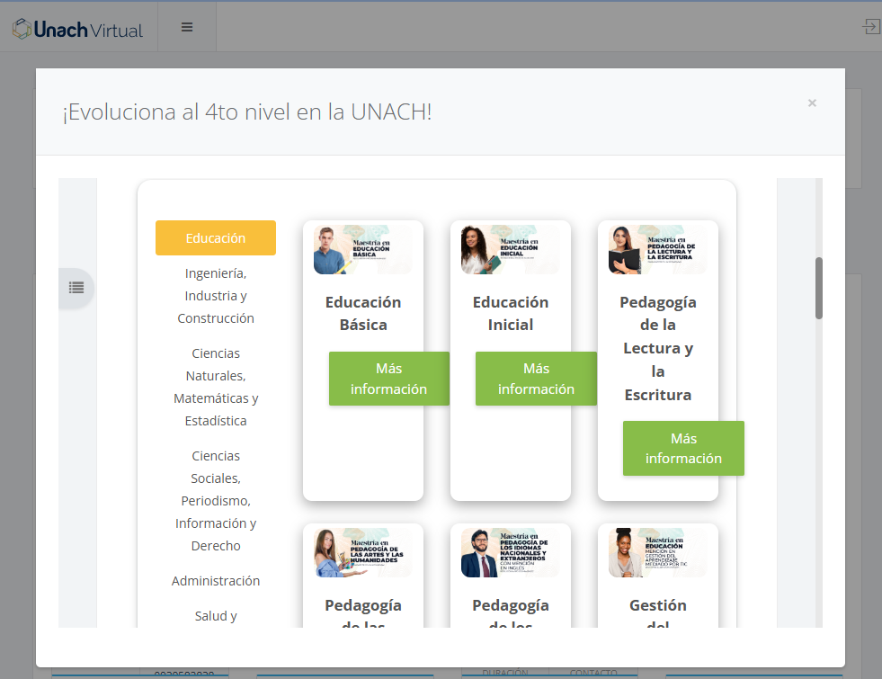 La ciudadanía puede ingresar a la oferta de la convocatoria vigente (la cual estará publicada en la página oficial de la Universidad Nacional de Chimborazo y/o en todas sus cuentas de redes sociales), en la cual el aspirante encontrará de forma resumida las maestrías ofertadas. En cada apartado del programa de maestría se puede encontrar la siguiente información: nombre del programa de maestría, modalidad, duración en meses, inversión total, el teléfono de contacto del Coordinador del programa, un botón que le lleva al formulario de Registro y un botón que le muestra el brochure del programa de maestría: