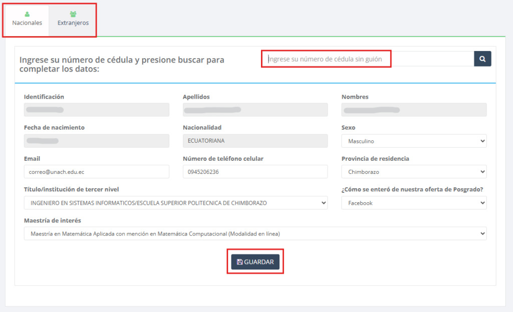 En la página de Registro tenemos dos pestañas para registrar nuestra información, una para ciudadanos ecuatorianos y otra para ciudadanos extranjeros. En la pestaña para ciudadanos Nacionales, debemos ingresar el número de cédula y presionar el botón de búsqueda, a continuación, se rellenarán automáticamente los siguientes campos: