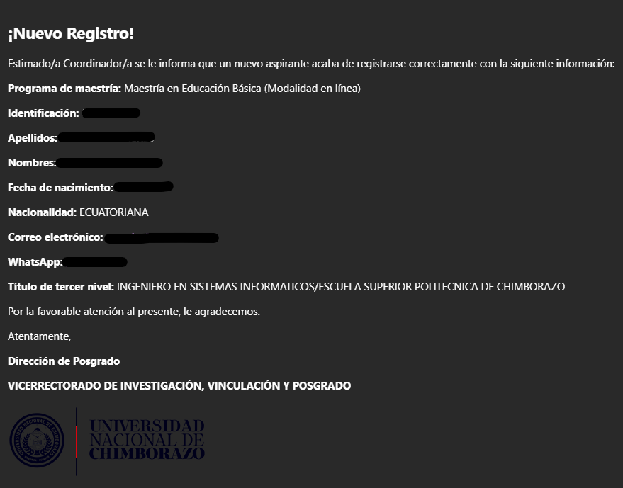 Además, se enviarán dos correos. El primero al correo del aspirante, el cual tiene el siguiente formato: