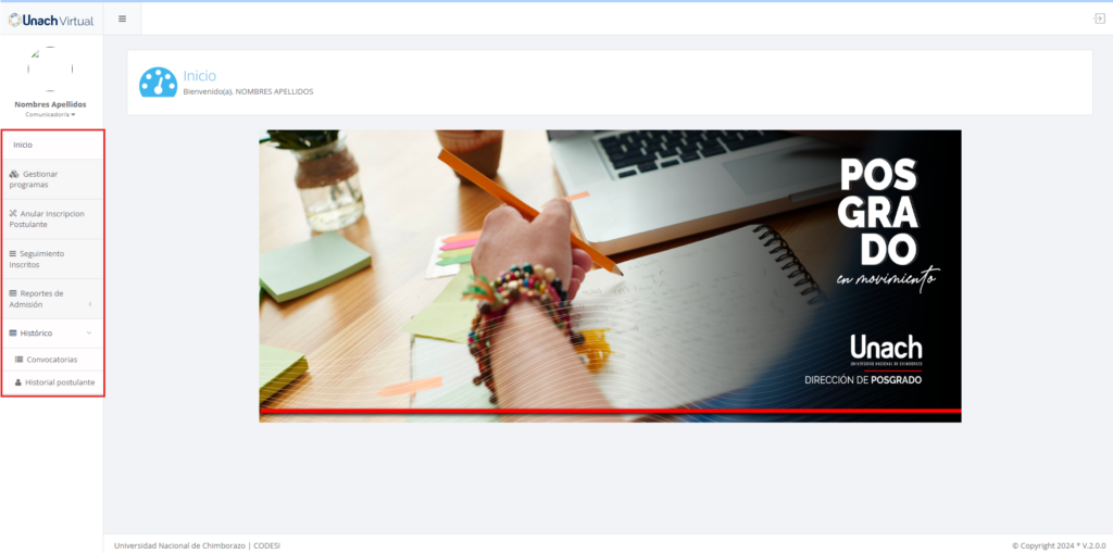 El usuario con el perfil Comunicador/a debe acceder al sistema con las credenciales de su correo electrónico institucional a través del siguiente enlace: https://app.unach.edu.ec:4437/