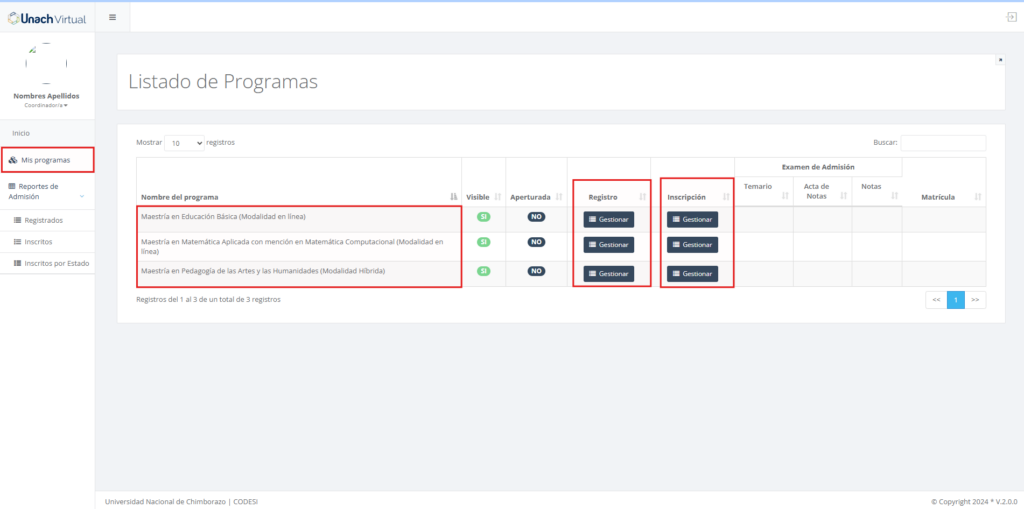 Cuando el/la Coordinador/a presiona el botón “Gestionar” de la columna “Inscripción”: