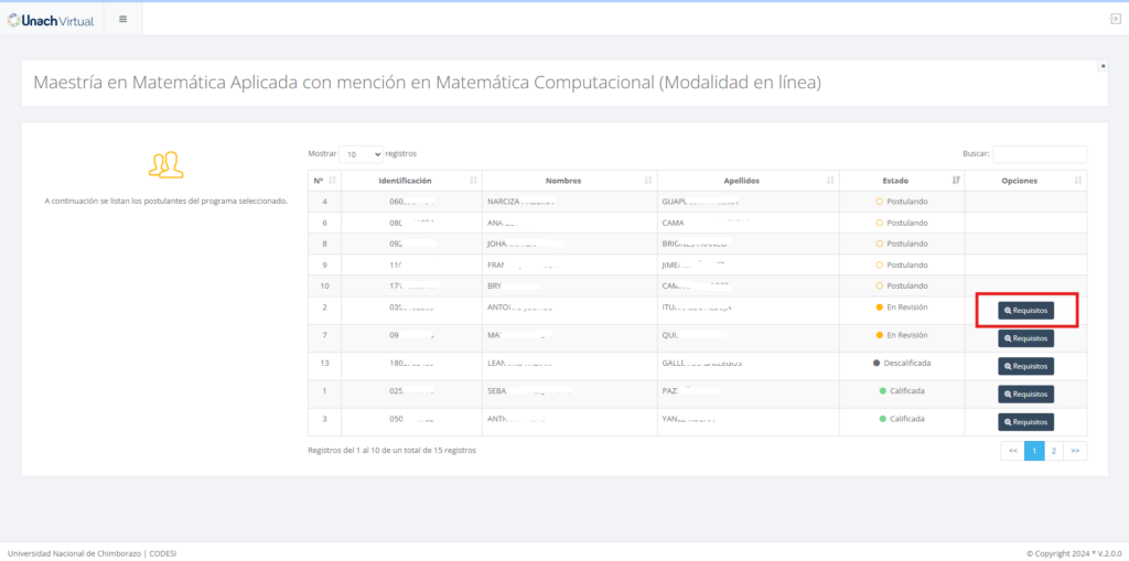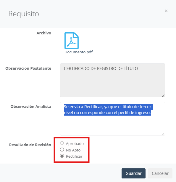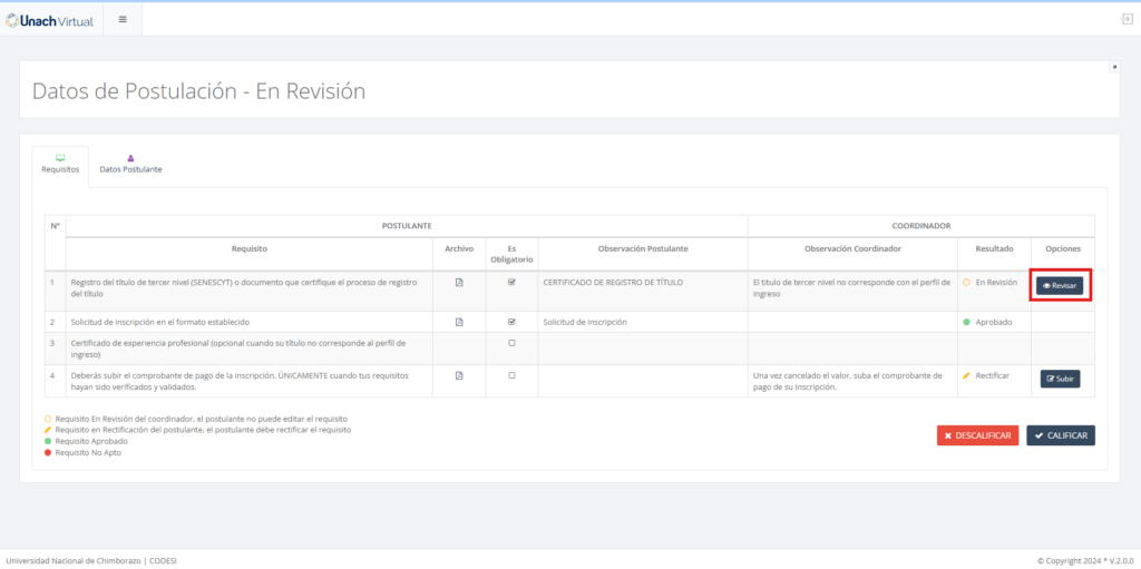 Requisitos. – en esta pestaña se podrá encontrar el listado de requisitos que el postulante envió para revisión; de cada uno de los mismos se podrá visualizar el archivo, si es o no obligatorio, las observaciones del postulante, las observaciones del Coordinador, el estado del requisito y las opciones (botones que se activan de acuerdo al requisito y al proceso).