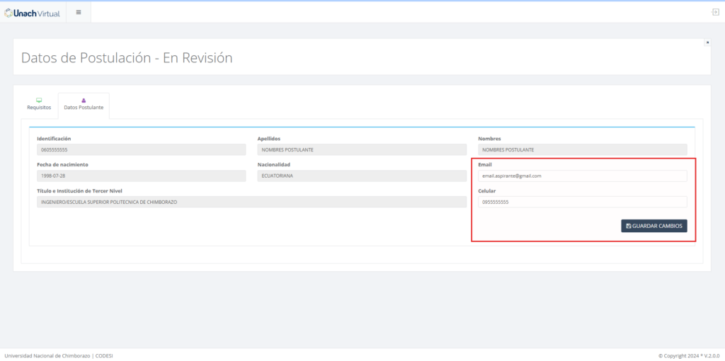 Datos Personales. – en esta pestaña se podrán visualizar los datos del postulante, con la opción de modificar el correo electrónico del postulante y el número de celular.