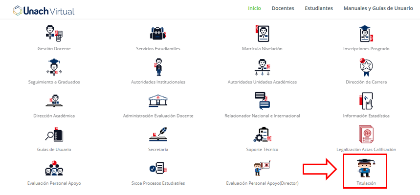 Para acceder al Sistema de Titulación, el primer paso es ingresar al portal Unach Virtual a través del siguiente enlace: https://uvirtual.unach.edu.ec