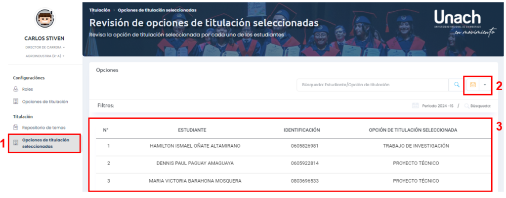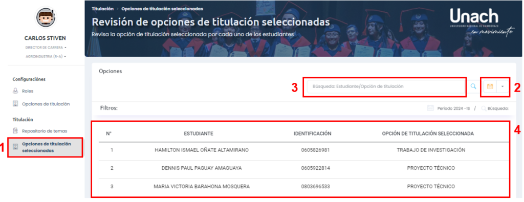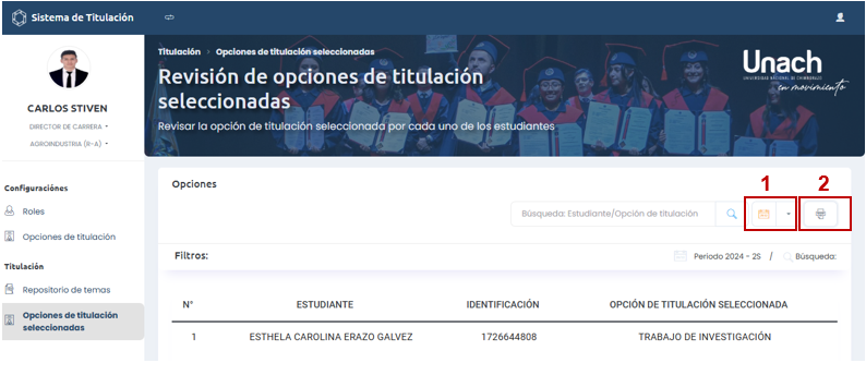 Ingrese al Sistema de Titulación, verifique que está trabajando con el Rol ‘Director de carrera’ y la carrera deseada.