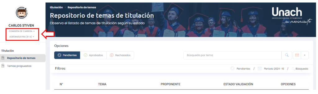 Ingrese al Sistema de Titulación, verifique que está trabajando con el Rol ‘Comisión de carrera’ y la carrera deseada.