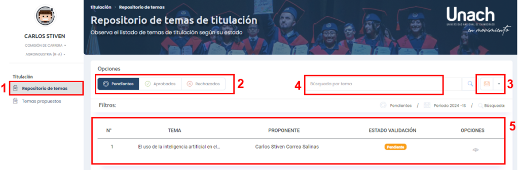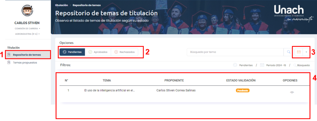 Uno de los métodos de búsqueda disponibles es a través del estado de validación del tema de titulación y el periodo académico, para esto únicamente debemos seleccionar estos ambos criterios en base a los requisitos de nuestra búsqueda y se mostrará la información filtrada en la tabla de resultados.