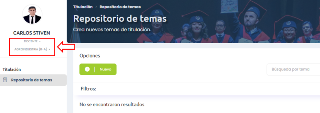 Ingrese al Sistema de Titulación, verifique que está trabajando con el Rol ‘Docente’ y la carrera deseada.