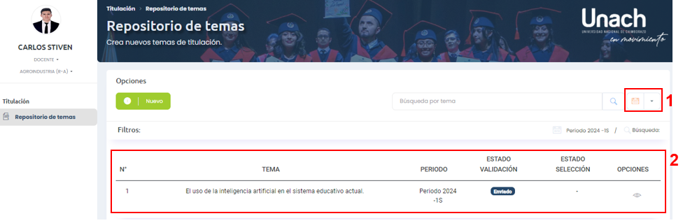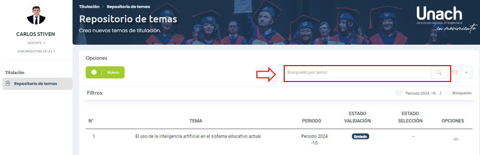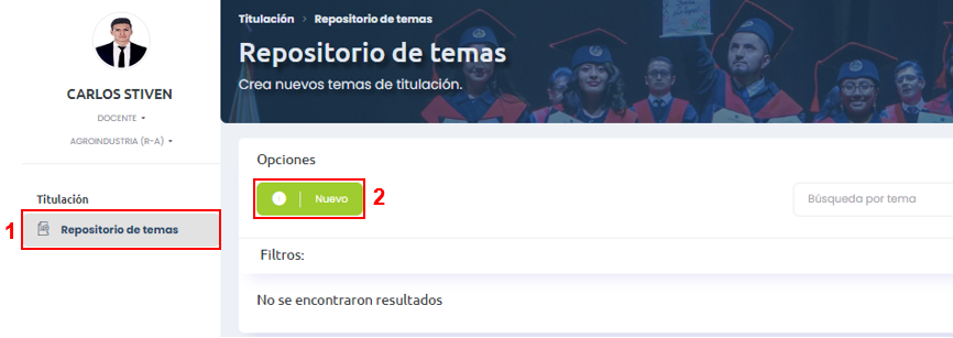 Para crear un nuevo tema de titulación el primer paso es ubicarse en la pestaña Repositorio de temas, luego damos clic en el botón ‘Nuevo’.
