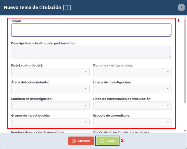 En la siguiente ventana debemos agregar todos los campos relacionados con el tema de titulación y por último damos clic en el botón ‘Enviar’.