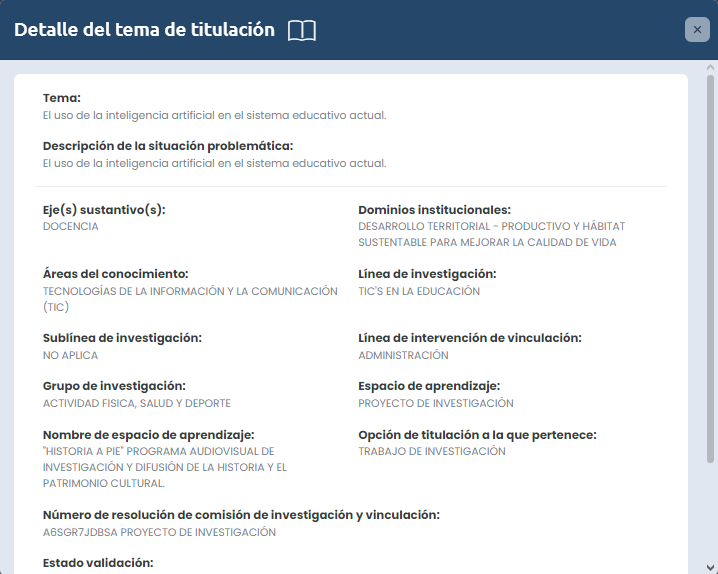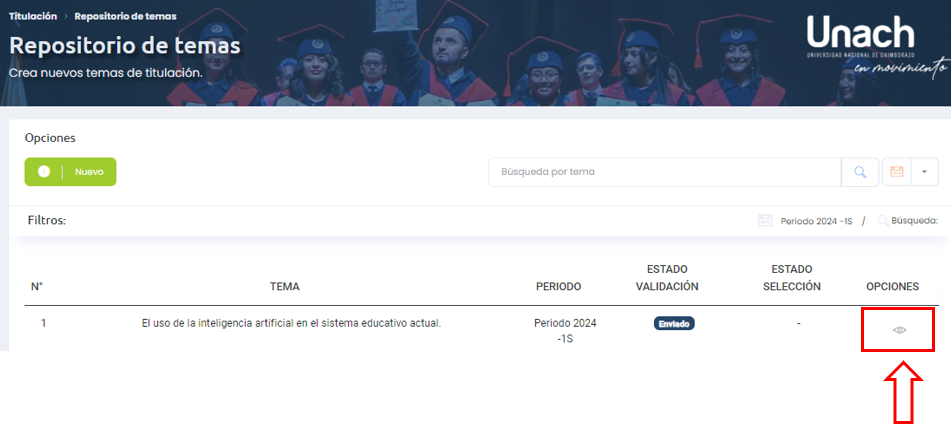 Una vez enviado el nuevo tema de titulación este se mostrará automáticamente en la tabla de resultados, si deseamos ver el detalle completo del tema podemos dar clic en la opción ‘Ver tema’ que se muestra en la parte derecha de la tabla de resultados.