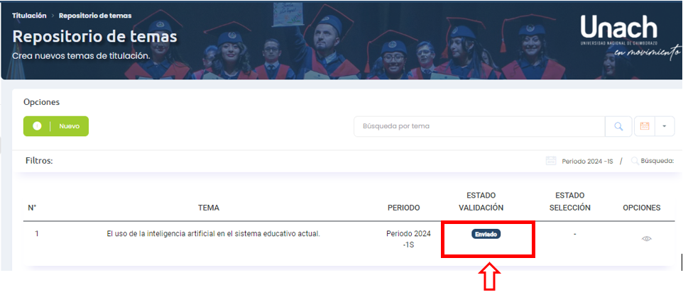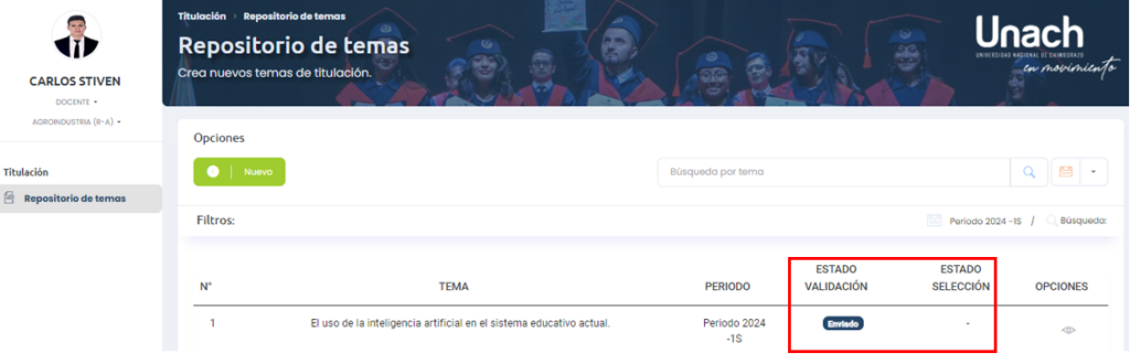 – Solicitado: Cuando un tema ha sido seleccionado por un estudiante pero esta selección se encuentra pendiente de aprobación.