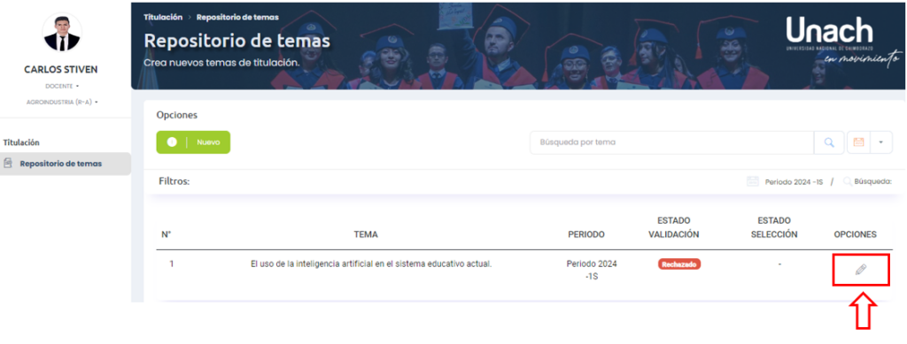 Para editar debes buscar el tema de titulación deseado y en la columna ‘Opciones’ damos clic en ‘Editar tema’.