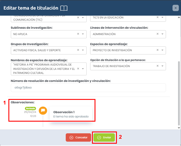 A continuación podremos visualizar la observación realizada al momento de la revisión, lo cual justifica el rechazo del tema, una vez realizada la respectiva corrección damos clic en ‘Enviar’ y automáticamente el tema cambiará de estado ‘Rechazado’ a ‘Enviado’.